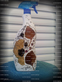 Подсвечник - бутылка, сигаретная обертка, розы из банановой кожуры, мак, пва, золотая краска спрей, штамповка черной гуашью, подрисовка черным лаком для ногтей.