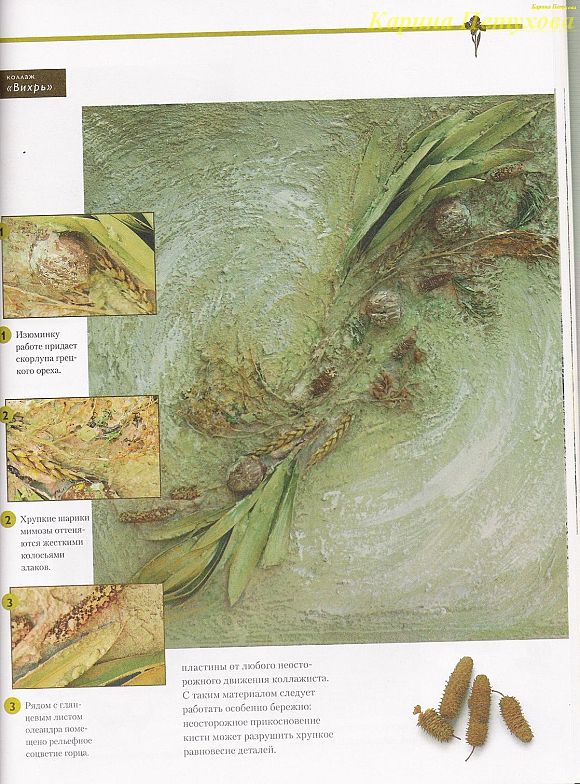 Особенность распределения дополнительного материала в коллажах "терра" заключается в том, что он не наклеивается, не закрепляется специальными приспособлениями, а "вмазывается" в раствор, вводится в фон. После этого излишки раствора аккуратно вычищаются и коллаж сохнет.