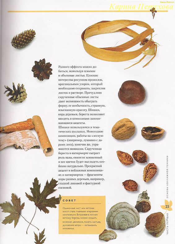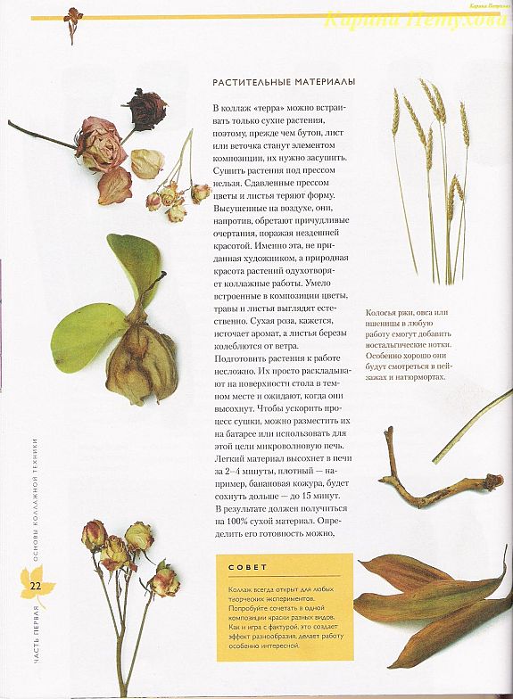 В коллаж встраивать можно только сухие растения. Сушить под прессом нельзя, так как растения, листья теряют свою форму, объем. Поэтому растительный материал сушите на воздухе. Причудливые формы вам будут даже на руку.