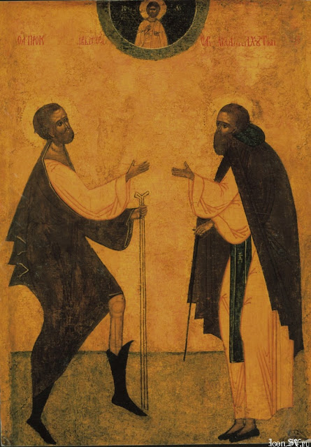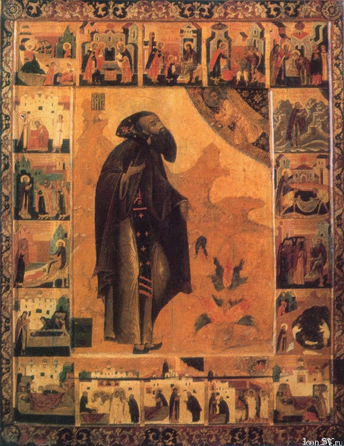 Видевше родители велие воздержание Твое, Отче Преблаженне, в печали бяху, да не в болезнь впадеши юн сый: Ты же Первоверховнаго Апостола глаголу внимая, яко брашно и питие не поставляет нас пред Богом, но токмо пост и молитва, усердно просил еси родители Твоя дати Тебе постом и молитвою страсти юношеския умерщвляти, да не поработят сия Духа: они же слышавше таковая, почудишася и оставиша Тя жити благому Твоему изволению, воспевающе Вразумившему Тя Богу благодарственную песнь: Аллилуиа!Икос 2