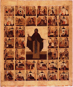 Видевше родители велие воздержание Твое, Отче Преблаженне, в печали бяху, да не в болезнь впадеши юн сый: Ты же Первоверховнаго Апостола глаголу внимая, яко брашно и питие не поставляет нас пред Богом, но токмо пост и молитва, усердно просил еси родители Твоя дати Тебе постом и молитвою страсти юношеския умерщвляти, да не поработят сия Духа: они же слышавше таковая, почудишася и оставиша Тя жити благому Твоему изволению, воспевающе Вразумившему Тя Богу благодарственную песнь: Аллилуиа!Икос 2