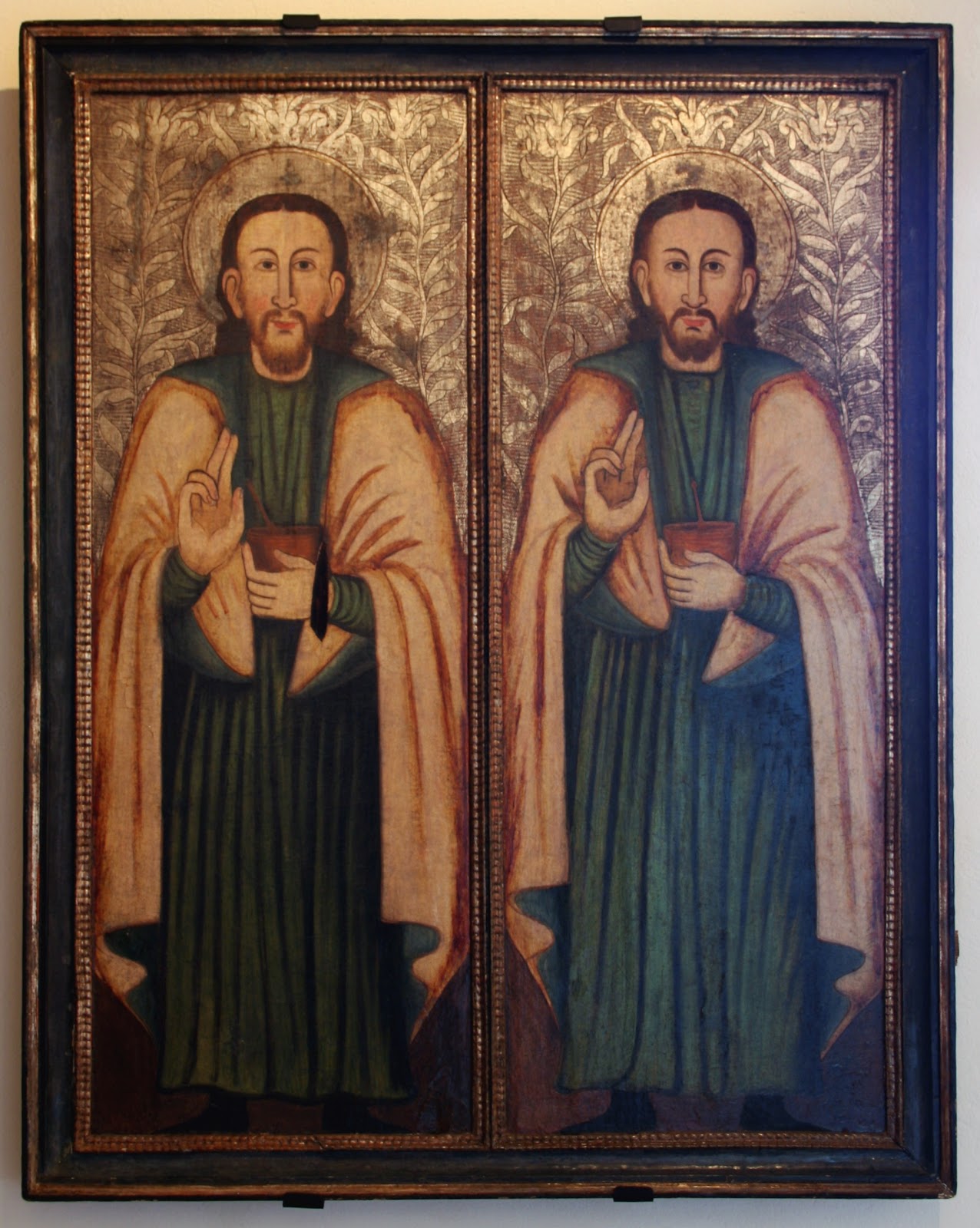 | Святые Косьма и Димиан Вторая половина XVIII века. Дерево. Размер 27х32см источник:http://antikvariat.dp.ua |