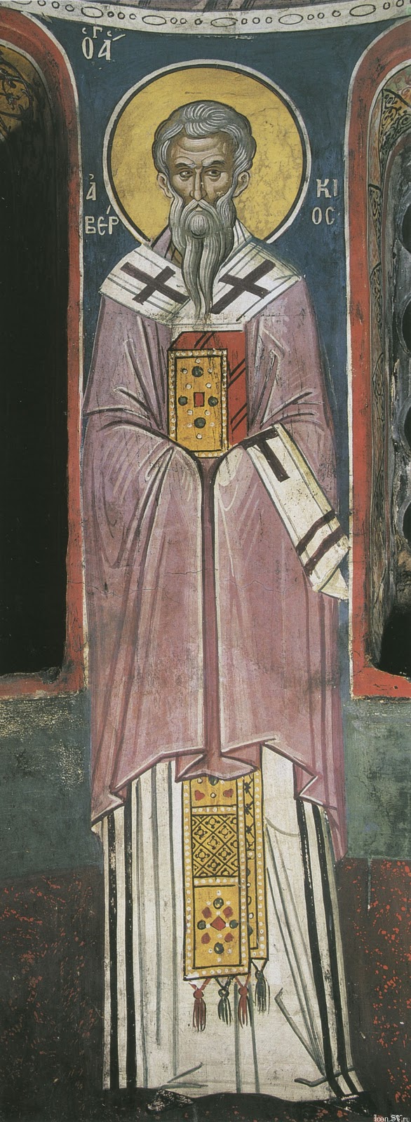 | Свт. Аверкий Иерапольский. Миниатюра. Иверский монастырь. Афон. Конец XV в. C 1913 года в Российской Публичной (ныне Национальной) библиотеке в Санкт-Петербурге. |