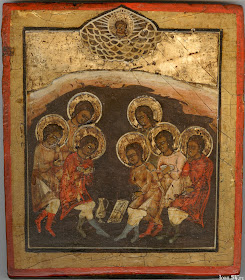Благочестия проповедники и воскресения умерших изобразители, Церкви столпи седмочисленныя, отроки всеблаженныя песньми восхвалим: тии бо по многих летех нетления, аки от сна воставше, всем возвестиша яве мертвых востание.