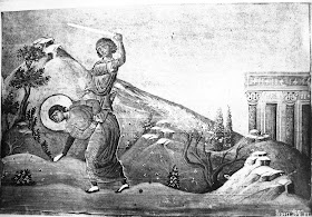 | Мученик Нестор Солунский Афон. Монастырь Протат. Фреска церкви Успения Богородицы. Начало XIV в. Мануил Панселин |