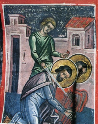 Мучение свв. Парамона и Филумена. Тзортзи (Зорзис) Фука. Фреска. Афон (Дионисиат). 1547 г. |