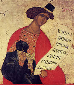 Услыши нас, грешных и непотребных, в час сей предстоящих пред святою твоею иконою и усердно прибегающих к ходатайству твоему. Моли о нас Человеколюбца Бога, да подаст нам дух покаяния и сокрушения о гресех наших и всесильною Своею благодатию да поможет нам оставити пути нечестия, приспевати же во всяком деле блазе, да укрепит нас в борьбе со страстьми и похотьми нашими; да всадит в сердце наше дух смирения и кротости, дух братолюбия и незлобия, дух терпения и целомудрия, дух ревности к славе Божией и спасению ближних. Упраздни молитвами твоими, пророче, злыя обычаи мира, паче же погибельный и тлетворный дух века сего, заражающий христианский род неуважением к Божественней Православней вере, к уставам святыя Церкви и к заповедем Господним, непочтением к родителем и влаcтем предержащим, и низвергающий людей в бездну нечестия, развращения и погибели. Отврати от нас, пречудне пророче, предстательством твоим праведный гнев Божий, и избави вся грады и веси царства нашего от бездождия и глада, от страшных бурь и землетрясений, от смертоносных язв и болезней, от нашествия врагов и междоусобныя брани. Укрепи твоими молитвами православных людей, благопоспешествуй им во всех благих деяниих и начинаниях к водворению мира и правды в державе их. Пособствуй Всероссийкому Христолюбивому воинству во бранех со врагами нашими. Испроси, пророче Божий, от Господа пастырем нашим святую ревность по Бозе, сердечное попечение о спасении пасомых, мудрость в учении и управлении, благочестие и крепость во искушениих, судиям испроси нелицеприятие и безкорыстие, правоту и сострадание к обидимым, всем начальствующим попечение о подчиненных, милость и правосудие, подчиненным же покорность и послушание ко влаетем и усердное исполнение своих обязанностей; да, тако в мире и благочестии поживше в сем веце, сподобимся причастия вечных благ в Царствии Господа и Спаса нашего Иисуса Христа, Емуже подобает честь и поклонение, со Безначальным Его Отцем и Пресвятым Духом, во веки веков.