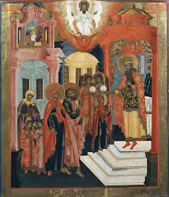 | ВВЕДЕНИЕ ВО ХРАМ Новгород XIV в. Из Троицкой церкви села Кривое на Северной Двине. 91 × 66 см. Государственный Русский Музей, Санкт-Петербург |