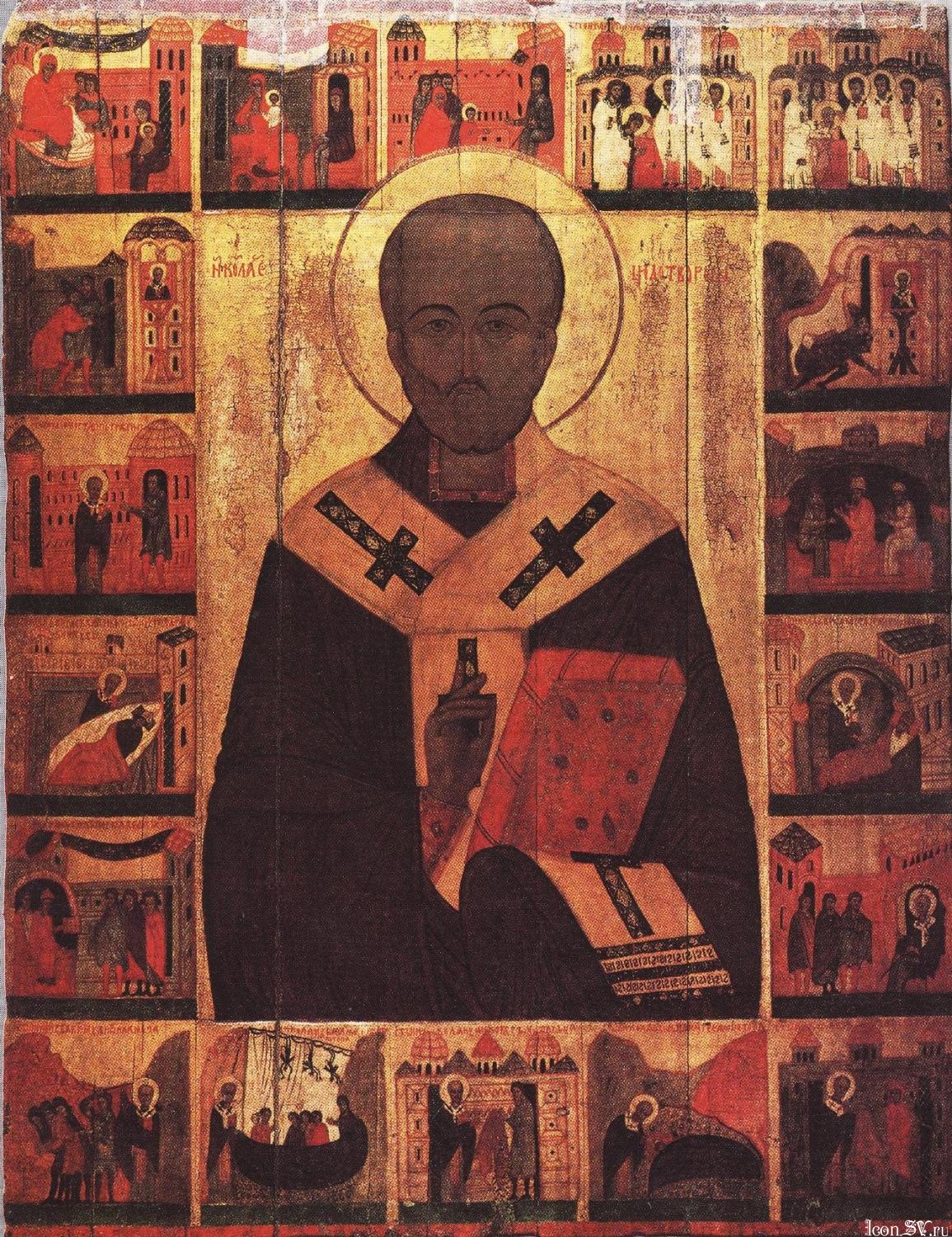 | Святитель Николай с житием Россия, Северное письмо, вторая пол. XVII в. 106 x 85,5 дерево. Левкас, темпера |