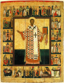 Ты еси отроком - послушания образ, юным - целомудрия светило, мужем - трудолюбия наставник, старым - незлобия учитель, иноком - воздержания правило, молящимся - вождь от Бога вдохновенный, мудрости ищущим - ума просветитель, витиям доброглаголивым - слова живаго источник неисчерпаемый, благотворящим - милосердия звезда, начальствующим правления мудраго образ, правды ревнителям - дерзновения вдохновитель, правды ради гонимым - терпения наставник: всем вся был еси, да всяко некия спасеши. Над всеми же сими стяжал еси любовь, яже есть соуз совершенства, и тою, яко силою Божественною, вся дарования во единем лице твоем воедино совокупил еси, и туюжде любовь, разделенная примиряющую, в толковании словес апостольских всем верным проповедал еси. Мы же грешнии, по единому кийждо свое дарование имуще, единения духа в союзе мира не имамы, бываем тщеславни, друг друга раздражающе, друг другу завидяще: сего ради дарования наша разделенная не в мир и спасение, но во вражду и осуждение нам являются. Темже к тебе, святителю Божий, припадаем, раздором обуреваеми, и в сокрушении сердца просим: молитвами твоими отжени от сердец наших всякую гордость и зависть, нас раздирающия, да во мнозех удех едино тело церковное будем, да по словеси твоему молитвенному возлюбим друг друга и единомыслием исповемы Отца и Сына и Святаго Духа, Троицу Единосущную и Нераздельную, ныне и присно и во веки веков.