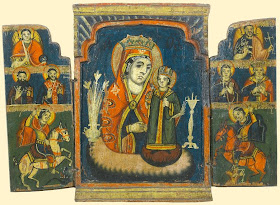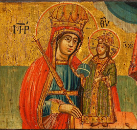 На двух болгарских и одной афонской иконах, которые принадлежат тому же иконографическому типу, Богоматерь как бы поддерживается облаком. Образ облака, который был связан в новозаветной традиции с Марией: "Тя Облак легок древле зрит просвещаем Духом Пророк Исайя, на Нем же седе славы Господь",— вспоминает и Андрей Критский в его "Слове на Рождество Богоматери".