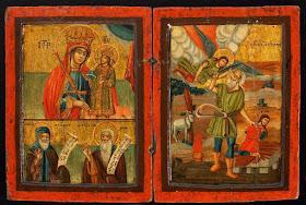 | НЕУВЯДАЕМЫЙ ЦВЕТ Складень-икона: Богородица Неувядаемый цвет, избранные святые и Жертвоприношением Авраама Греция, ок. 1800. Дерево, темпера. 17.5 x 26.5 см. Частное собрание, Лондон |