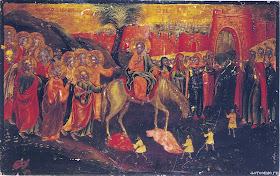 Ἐπὶ πώλου ὄνου εἰς τὴν Σιών, εἰσῆλθες Σωτήρ μου, ὑπὸ παίδων καὶ τῶν βρεφῶν, αἰνούμενος Λόγε, τὸ Ὠσαννὰ βοώντων, εὐλογητὸς ὁ ἥκων, σῶσαι τὸν ἄνθρωπον.