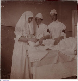 | Императрица Александра Федоровна — сестра милосердия. Царевны тоже служили сестрами милосердия в госпиталях во время Первой мировой войны, ассистировали хирургам при операциях. |
