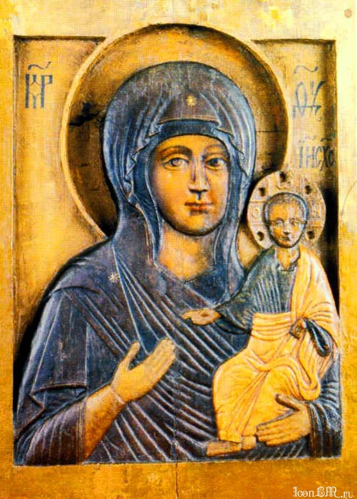 Икона сия, из воскомастики, принесена из Иерусалима в Константинополь и императрицею Пульхериею поставлена была в церкви Влахернской (Влахерны - часть Константинополя); император Ираклий имел ее с собою в походе против Персов. Впоследствии сохраняли ее на Афоне и в 1653 году прислали в дар царю Алексею Михайловичу. Теперь находится в Московском Успенском собор, в приделе Апостолов Петра и Павла.