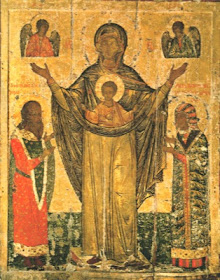 | "Мирожская". Икона. Псков. 2-я половина XVI в. 144 х 112. Вероятно, из Мирожского монастыря. Псковский государственный объединенный историко-архитектурный и художественный музей-заповедник. |