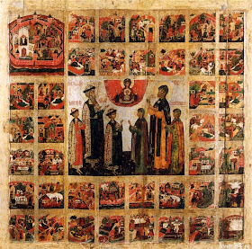 | Икона Муромских святых князя Константина со чадами Михаилом и Феодором, Петра и Февронии и Иулиании Лазаревской с житием Петра и Февронии. XVII в. |