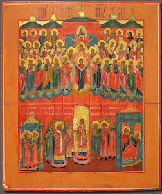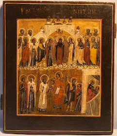 | ИЗБРАННЫЕ СВЯТЫЕ С ПОКРОВОМ БОГОРОДИЦЫ композитная икона Россия, автор: А.Г.Яковлев, 1888 г., С-Петербург, кипарисовая паркетная доска, левкас, масло. Частное собрание. |