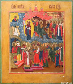 Архангел и Ангел множеством со Предтечею, Богословом и всех святых ликом сопредсташа Тебе, Царице своей, в церкве Влахернстей и, умиленная моления Твоя о всем мире Слышавше, со удивлением возопиша таковая: