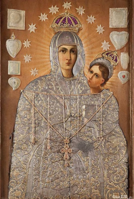 Пресвятая Богородице, Дево Владычице, высшая Ангел и Архангел, и всея твари Честнейшая! Услыши нас, молящихся тебе, и яви милость Твою на людех Твоих. Помяни, Всемилостивая Госпоже, предстоящия люди и ради благословных вин оставшихся и помилуй их и нас по множеству милости Твоея: сокровицща их исполни всякаго блага, супружества их в мире и единомыслии соблюди, младенцы воспитай, юность настави, старость поддержи, малодушныя утеши, расточенныя собери, прельщенных вразуми, стужаемыя от духов нечистых свободи, плавающим сплавай и путешествующим спутешествуй, вдовицам предстани, сирых защити, плененныя избави, недугующих исцели. на судищи и в рудах, и в заточении,и в горьких работах, и во всякой нужде и обстоянии сущих облегчи, возстави и помилуй. Изряднее ж Церковь Сына Твоего соблюди и сохрани в долготу дний, Ты бо еси, Госпоже, Надежда наша и Заступница всех притекающих к Тебе, и Твоея святыя помощи просящих.Тем же всечестный образ Твой и рукою Твоею держимаго Вседержителя видящи на иконе радуемся грешнии, с умилением припадающе и любовию сей целуем, чающе, Госпоже, Твоими святыми Богоприятными молитвами сподобитися и небесныя бесконечныя жизни, и непостыдно стати в день судный одесную Сына Твоего и Бога нашего, славяще Его купно со Безначальным Отцем, и Пресвятым, Благим и Животворящим Духом, во веки веков.