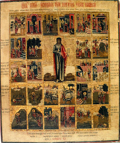 | Строгановский иконописный лицевой подлинник. 24 сентября (фрагмент). Русь. Конец XVI - начало XVII в. (издан в Москве в 1869 году). В 1868 году принадлежал графу Сергею Григорьевичу Строганову. |