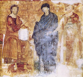 | Богородица приводит ко Христу св. Владислава. Фреска храма Вознесенского монастыря (Милелева). Сербия. 1219 - 1228 годы. |