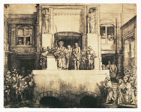 Самый знаменитый среди гравированных. Исполнен он в 1639 году. Рембрандт стоит, опираясь на каменный подоконник. В это время он самый модный художник Амстердама. Потенциальные заказчики записываются в очередь едва ли не на годы вперед. Он, естественно, богат. У него прекрасная любящая и любимая жена. Обо всем этом сообщает портрет. Парадное изображение очень успешного человека. Немного позерства, немного тщеславия. Необычен его костюм, который на столетие старше портрета. Наряд художника XVI века сообщает зрителю о связи изображенного с великими мастерами прошлого, о том, что он их преемник. Образ крупного Северного мастера. Надо сказать, что Рембрандт - второй мастер Голландии, после Луки Лейденского, бывшего первым художником страны мельниц и тюльпанов до него, не поехал в Италию, бросая тем самым вызов родине искусства и заявляя о независимости собственного гения. Однако искусство Италии он, конечно, хорошо знал. Что и демонстрирует в этом портрете, вызывающем в памяти позднеренессансные произведения.