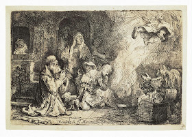 Рембрандт гравирующий, долгое время считали, что рисующий, пока один искусствовед не доказал изображения процесса гравирования. Автопортрет создан уже после смерти Саскии - первой жены художника, рокового события биографии художника. От блеска и роскоши предыдущего изображения не осталось ничего. Все погружено во мрак, из которого слабо проступают черты одного из величайших художников в истории.