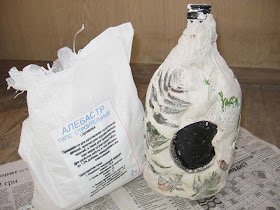 Раздумывая над тем, как поместить в гипс бутылку, одним из вариантов было использование пластикового ведерка – закрепить изнутри на его стенках листья и раковины, поставить внутрь бутылку и залить гипсом. Но от этой идеи я отказалась, т.к. в данном случае, во-первых, гипс принял бы форму ведерка, а верхнюю часть бутылки пришлось бы формировать дополнительно вручную; во-вторых, те места на стекле, которые нужно было оставить чистыми, закрыв их масками, также оказались бы под слоем гипса. Поэтому решила «обернуть» бутылку в гипс. Для этого за неимением песка расстелила в картонной коробке с невысокими бортиками мягкую ветошь, сверху накрыла целлофаном и разложила на нем листья, веточки и пустые раковины улиток. На бутылку наклеила маски из самоклеящейся пленки в форме аммонита. Развела гипс как в вышеуказанном МК и добавила в него ПВА, чтобы раствор застывал медленнее. Равномерно распределила гипс по поверхности пакета, оставив чистым место в центре – туда положила бутылку одной из сторон с маской вниз и быстро стала заворачивать ее в пакет. Столкнулась со следующими неудобствами данного метода: несмотря на то что я старалась работать очень быстро гипс застывал еще быстрее и к тому моменту когда я обернула бутылку полностью он уже был настолько твердым, что подправить форму было нельзя. Кроме того жидкий раствор с краев пакета стекал к центру из-за чего слой гипса в нижней части оказался толще чем было нужно, а на ту сторону бутылки, что была сверху, его не хватило несмотря на то, что все было рассчитано с запасом. Не знаю насколько понятно мне удалось описать этот процесс словами, но как оказалось фотографию тогда я сделала только одну. Вот что получилось