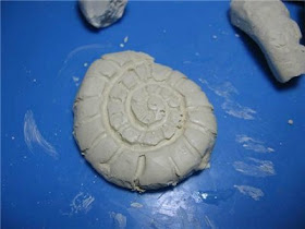 Из керапласта скатала колбаску, сильно сужающуюся к одному концу. Затем деревянной палочкой сделала углубления по всей длине и стала сворачивать спираль. Но керапласт оказался совершенно неэластичным (возможно я его недостаточно размяла перед началом работы) – при сворачивании он ломался на сгибе . И если внешнюю часть аммонита мне удалось подправить, замазав трещины, то попытки улучшить серединку ни к чему хорошему не привели. Решила оставить как получилось, в надежде, что после высыхания керапласта мне удастся как-то исправить результат